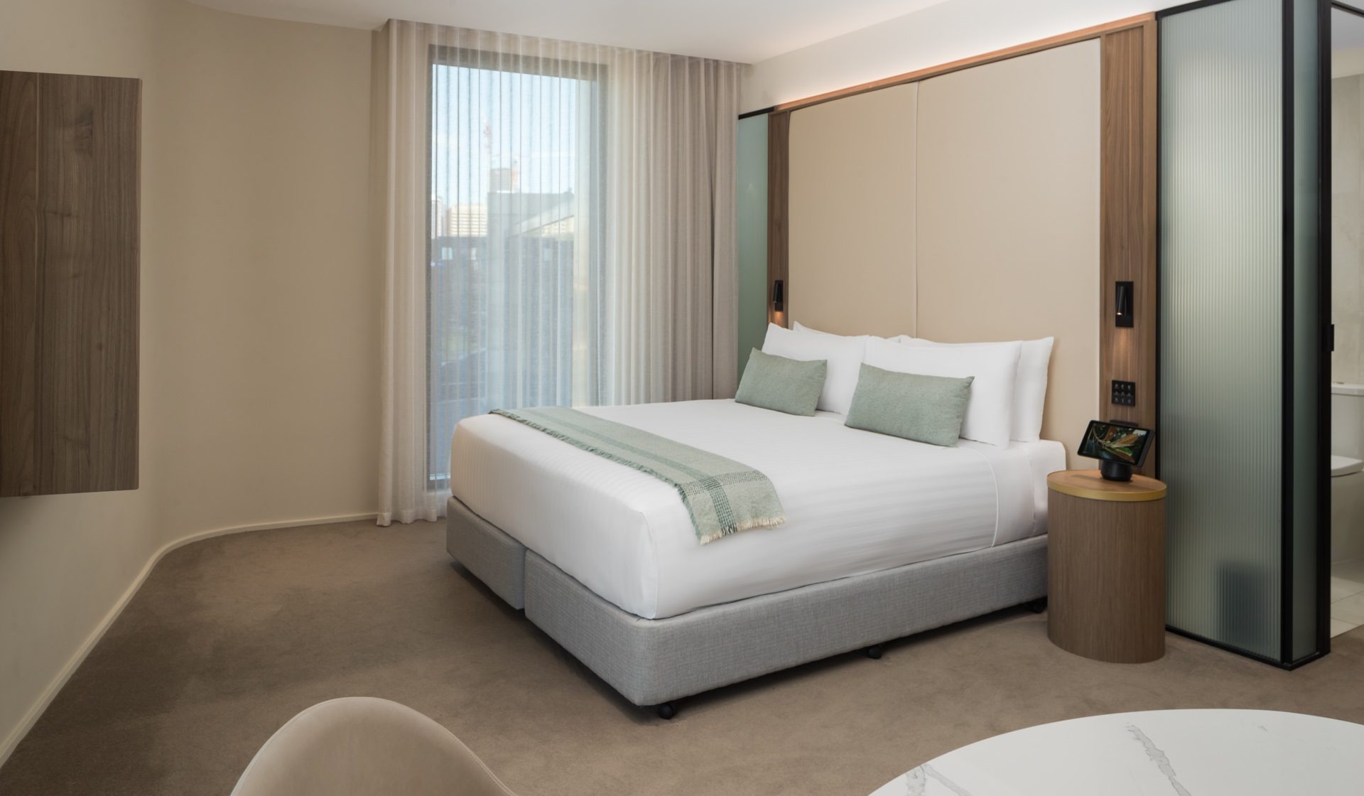 A room that perfectly captures the beauty of Adelaide’s parklands, while offering total escape in which to relax and enjoy the view. Contemporary design and intuitive room controls are elevated by your custom ‘The Moment’ king bed. Your ensuite bathroom is a private haven, complete with walk-in rain shower and premium amenities. Unwind with a drink in our guest lounge, or with your in-room entertainment extras.