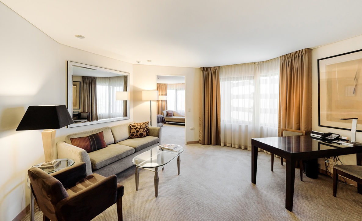 An indulgent and generously-sized space to relax and unwind with a spa bath. Junior Suites are perfect for those wanting more space and an added touch of luxury while staying in Adelaide. Offering a decadent King bedroom, suites feature a separate lounge room, kitchenette, 55″ televisions and extended minibar offering. An ensuite bathroom boasts Appelles amenities, walk-in shower and a spa bath to soak and unwind at the end of the day. Other thoughtful Playford touches include a Nespresso coffee machine, plush bathrobes and slippers, and complimentary movies. An extra living room, combined with soft colours and lush interiors, make this an ideal suite to truly relax. Average room size: 47sqm