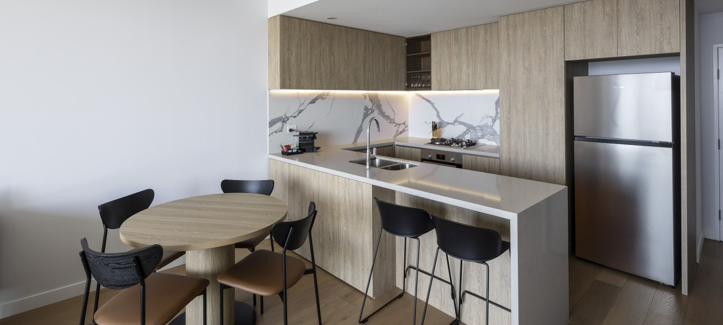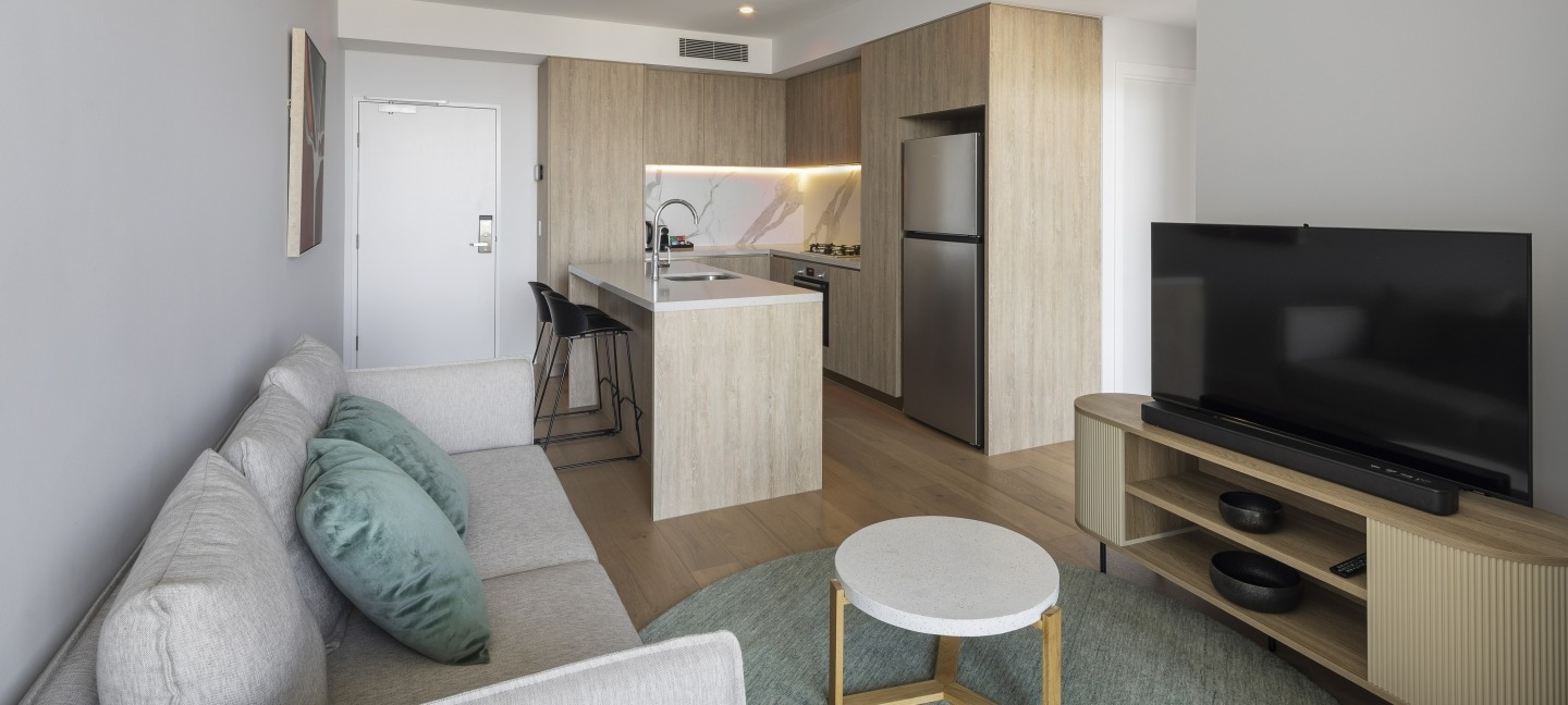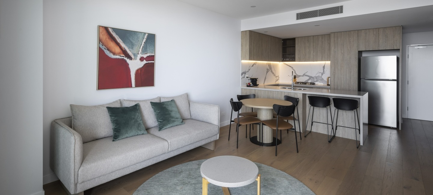 The spacious 1-bedroom self-contained apartments offer all the comforts of home, including a bedroom with a Queen bed, living room, kitchen and laundry facilities. There's also unlimited Wi-Fi, Foxtel and the ability to cast the TV with your phone or computer to access Netflix, Stan etc. Each apartment is beautifully furnished with a neutral colour palette to invoke a feeling of serenity.