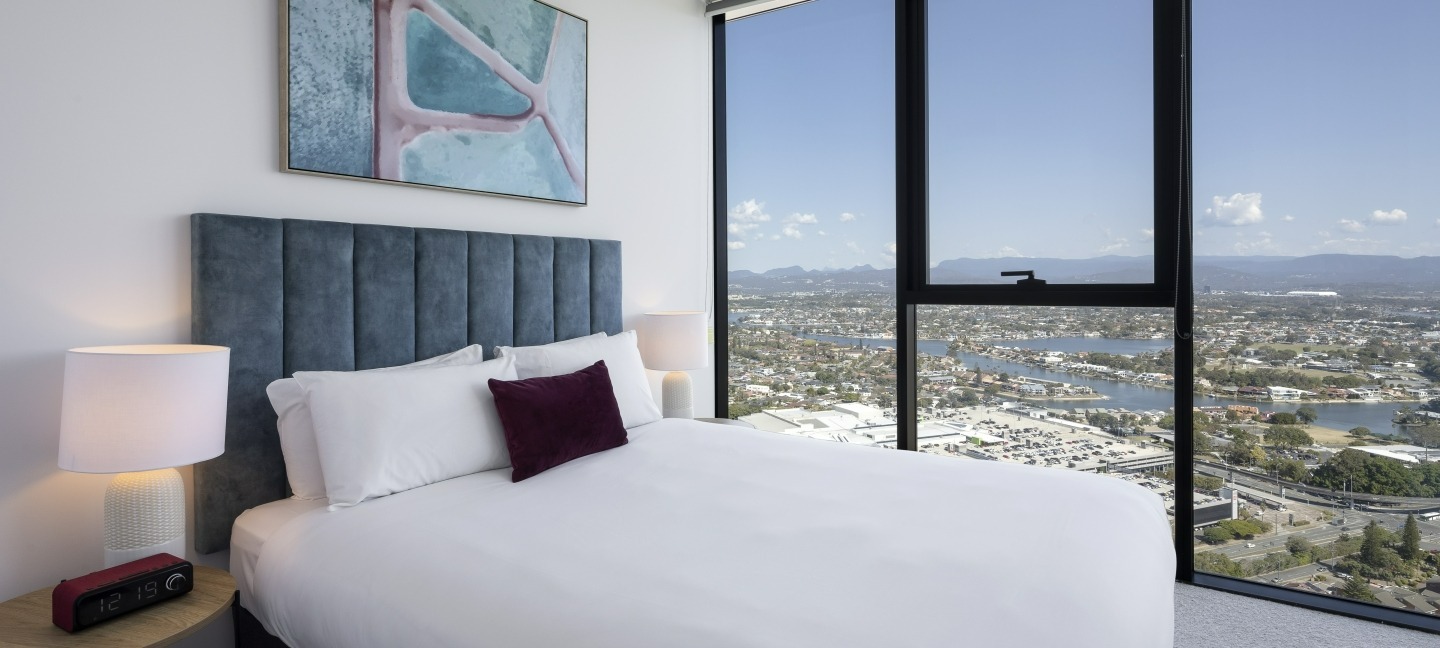 Dorsett Gold Coast rooms are inspired by the modern-day guest. Designed to be endlessly elegant, but with a dash of Gold Coast personality, all guest rooms are contemporary, innovative, and highly comfortable. Well-appointed room categories cater for all requirements. Whether you are a solo traveller, a couple, a family of four, or part of a larger group, there is a range of options to select from. High-value is guaranteed across all room types, suiting a variety of budgets. The sleek rooms are complemented with either glistening Gold Coast views, or tropical hinterland vistas. Deluxe and Executive Rooms include private balconies, whilst all room categories offer a host of modern amenities and facilities, including complimentary high-speed Wi-Fi. Browse our guest room categories below and select your perfect Gold Coast retreat.